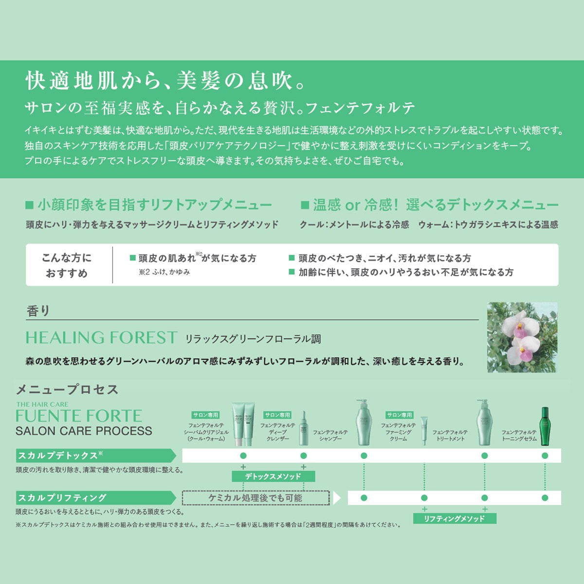 頭皮バリア機能を強化して、肌あれ(赤み・ふけ・かゆみ)などの頭皮トラブルを改善しながら、トラブルの起きにくい健康な頭皮へと強化し、美髪の育成をサポートします。