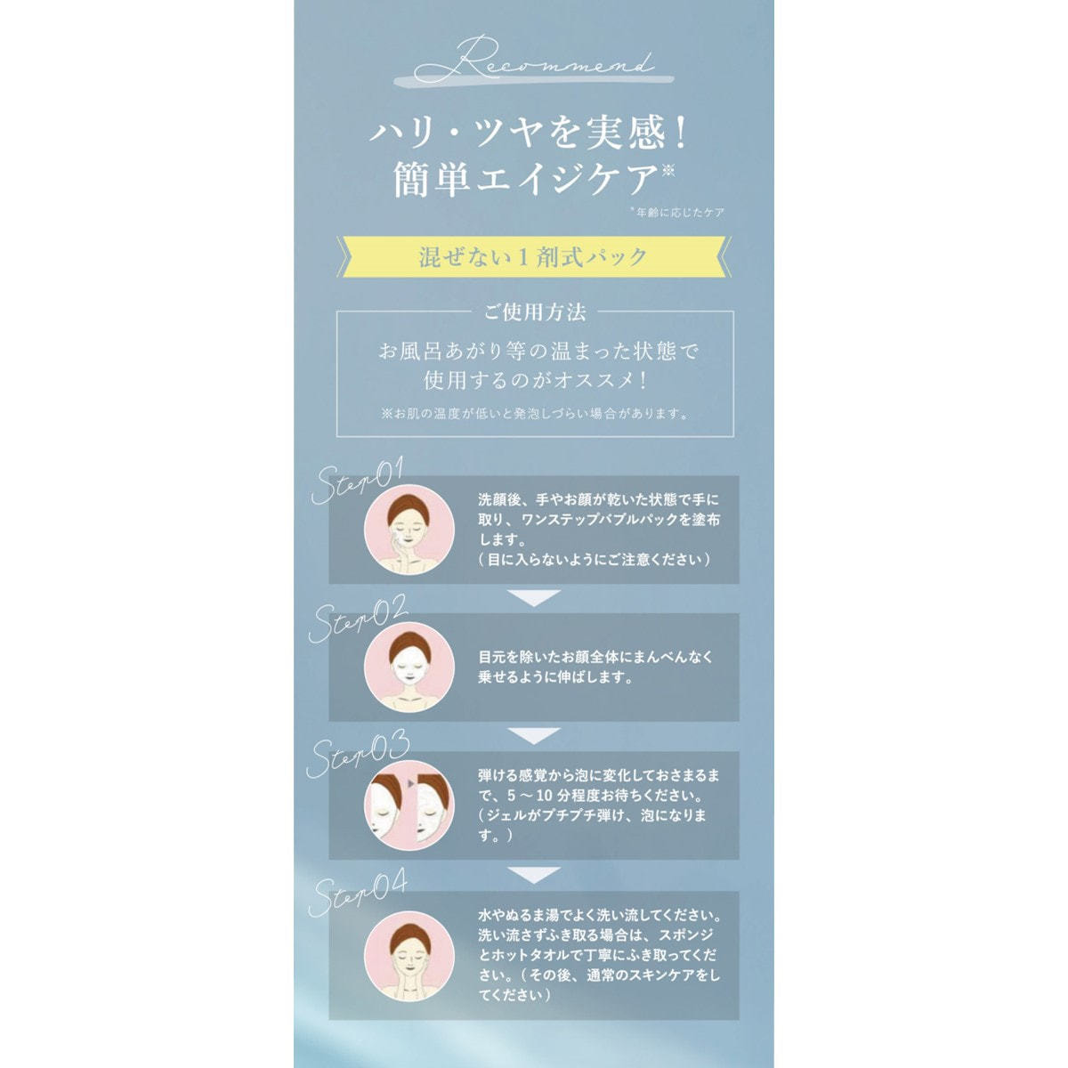 洗顔後、手やお顔が乾いた状態で手にとり、ワンステップバブルパックを塗布します。